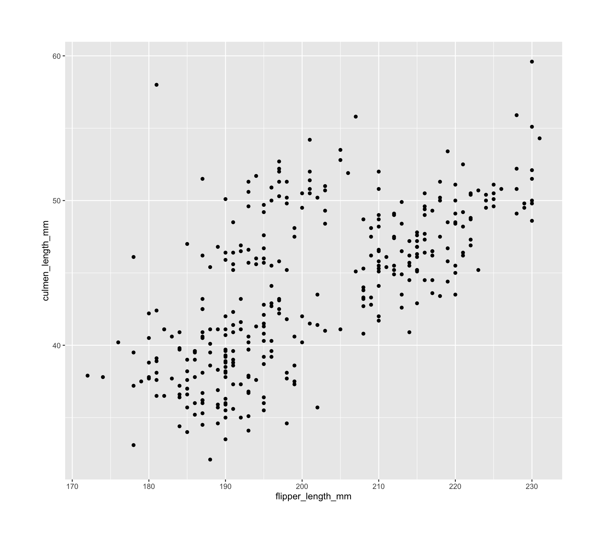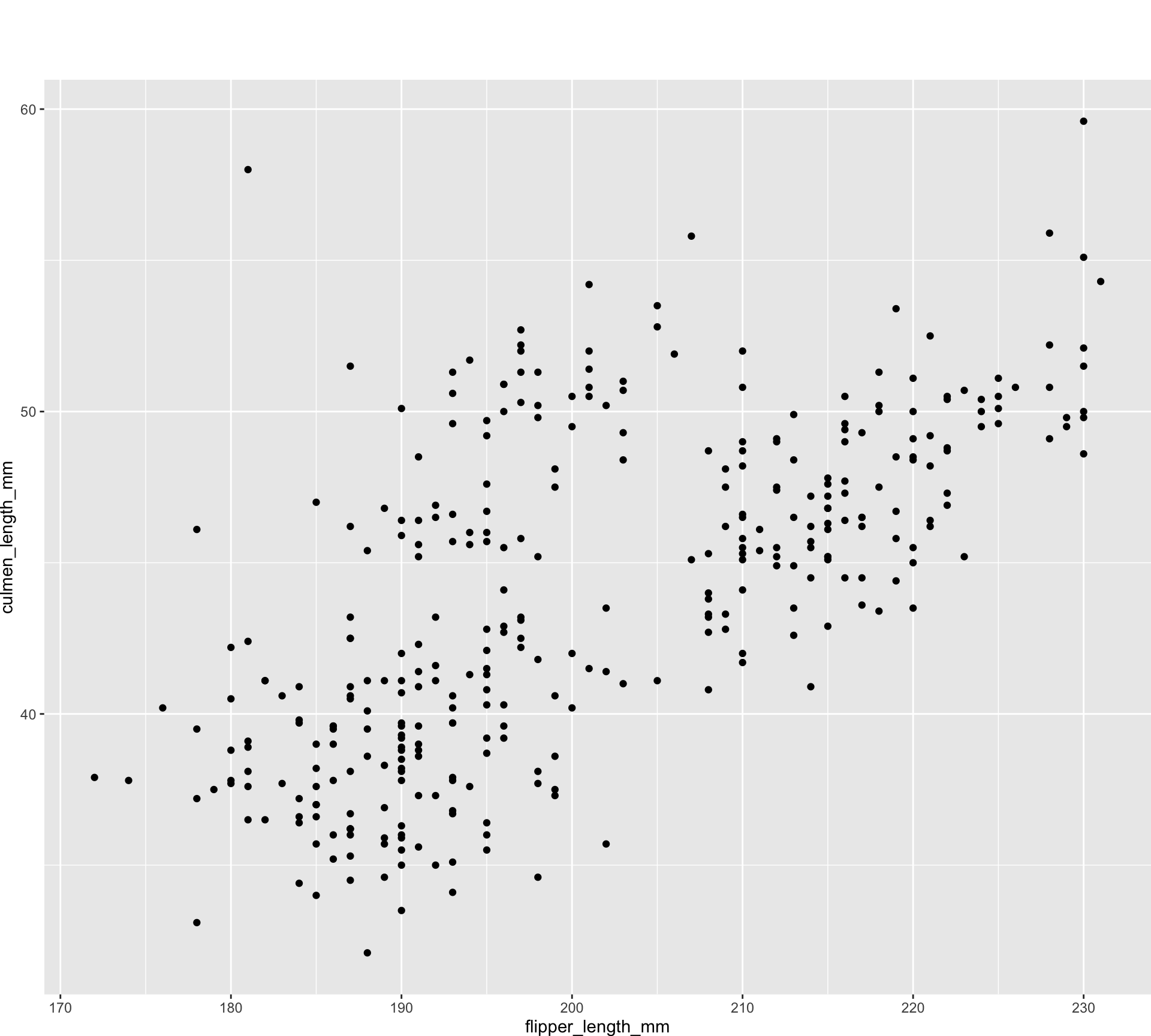 geom_point(aes(x = flipper_length_mm, y = culmen_length_mm)) +
