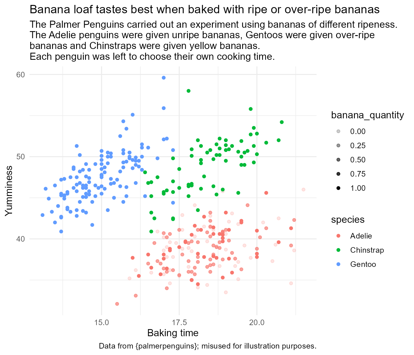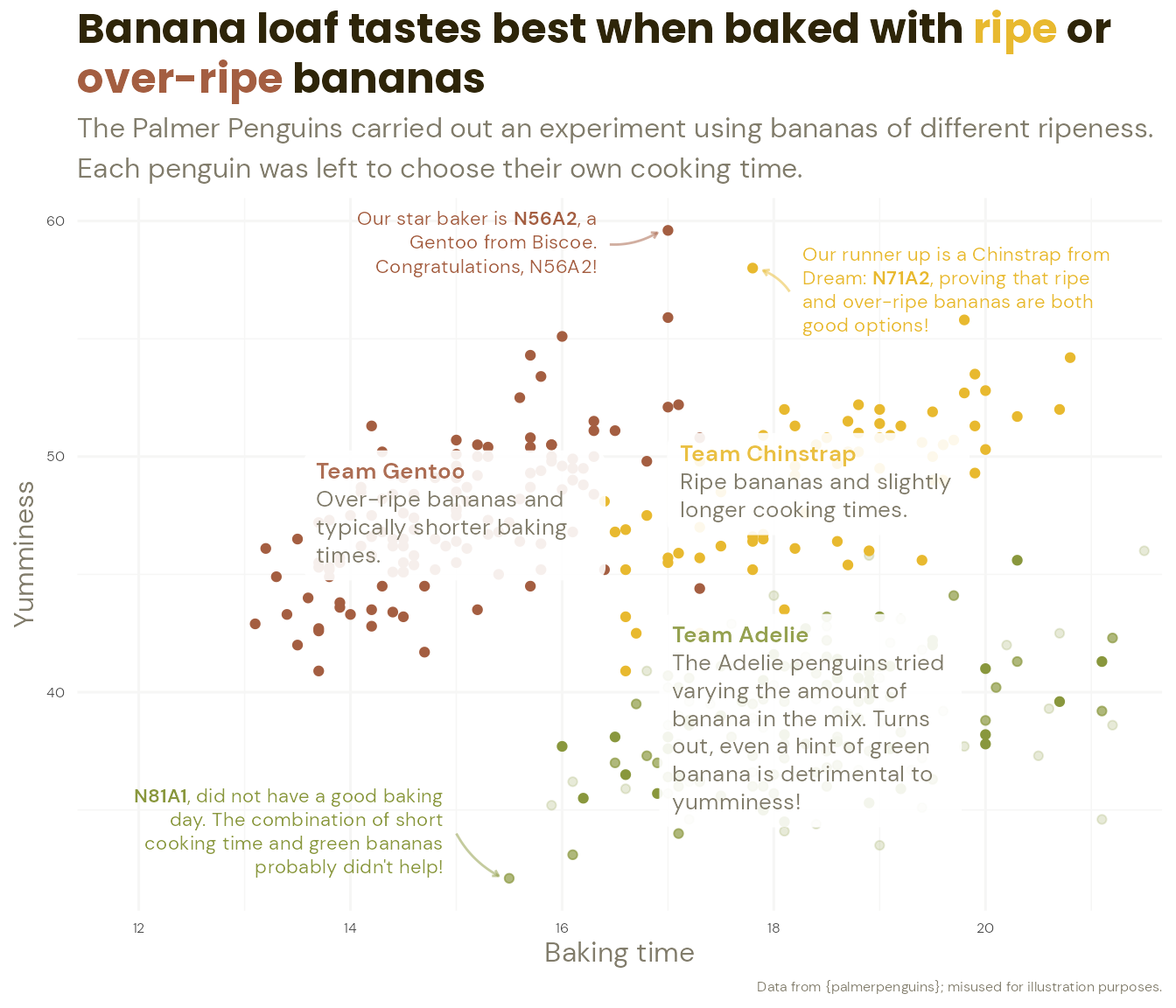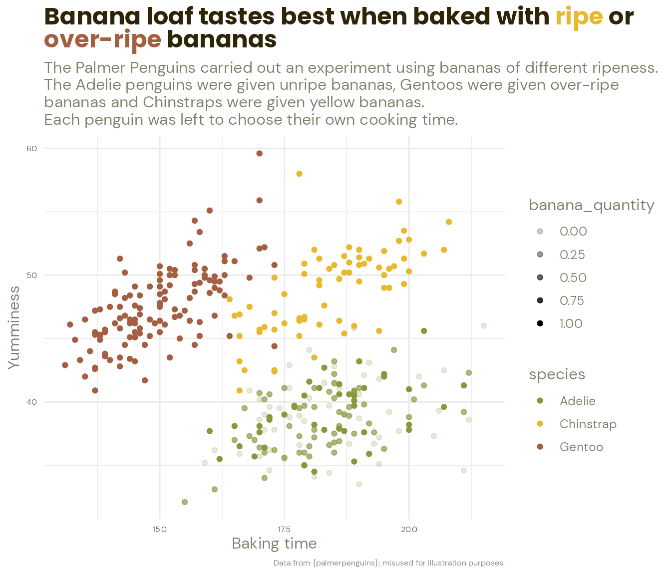 {ggplot2} and introducing {ggtext}{palmerpenguins})The penguins had a baking competition to see which species could make the best banana loaf. Each species was given bananas of a different level of ripeness.