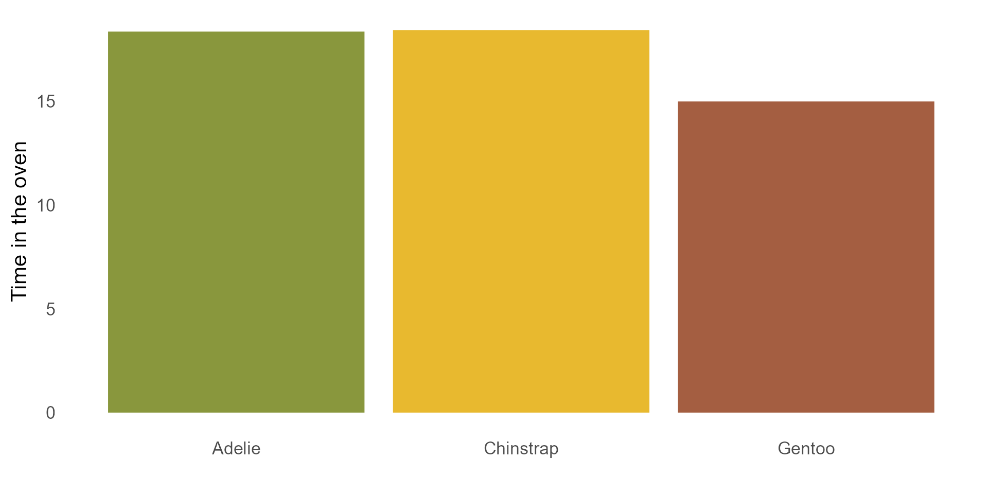 The penguins also baked their cakes for different amounts of time. Here are the mean durations per species. Which species left their cakes in the oven for longest?