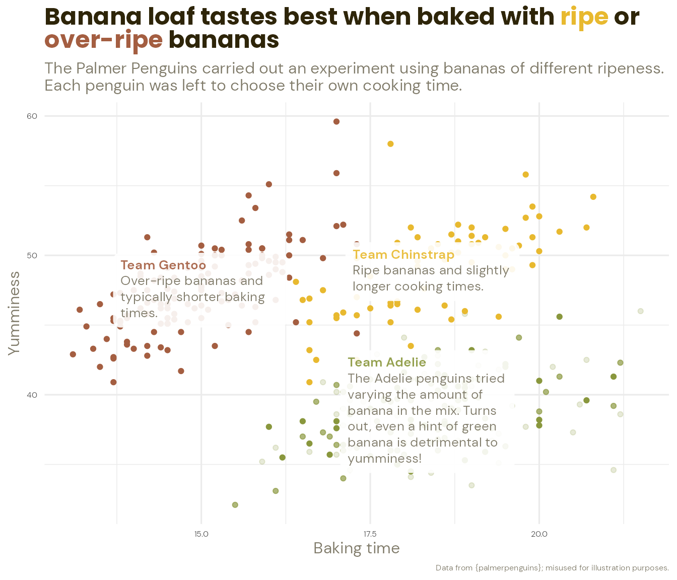labs(title = paste0("Banana loaf tastes best when baked with <span style=\"color:", banana_colours$Chinstrap, "\">ripe</span> or<br><span style=\"color:", banana_colours$Gentoo, "\">over-ripe</span> bananas")) +